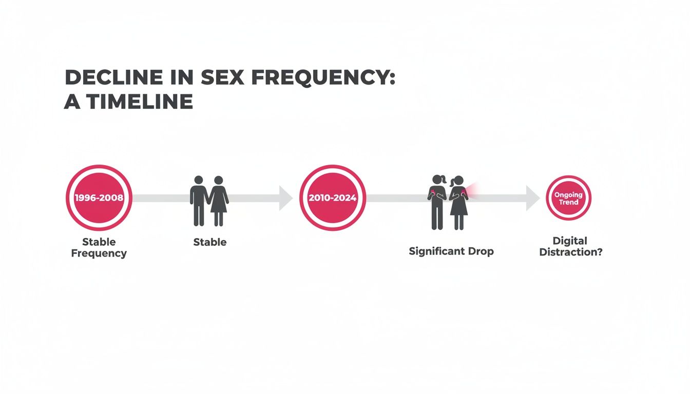 This isn't just a hunch. The data tells a clear story. Between 1996 and 2008, 59% of married adults said they had sex at least once a week. But from 2010 to 2024, that number fell to just 49%. Researchers point directly at digital distractions, noting a drop in sexual frequency when couples swap quality time for screen time. There's even a new term for it: "bedtime procrastination," where we lose hours to our devices right before sleep, effectively erasing opportunities for connection. You can dig into the research behind the sex recession to get the full picture.